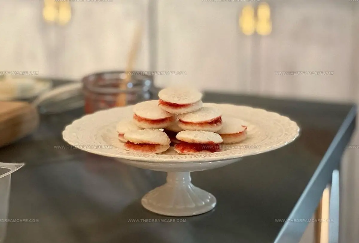 Jam penny sandwiches celebrate British royal tea tradition with miniature bread rounds slathered in sweet strawberry or raspberry jam.