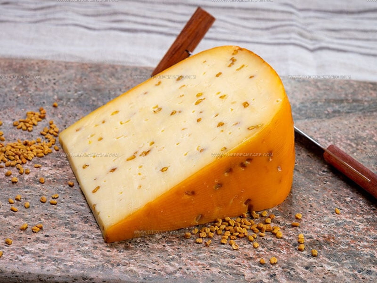 Fenugreek Gouda offers smooth, semi-hard cheese with soft edges. Its flavor hints at nutty caramel notes.