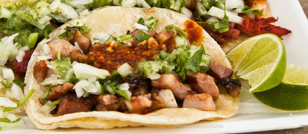 Tacos al pastor represent a mouthwatering fusion of Mexican and Lebanese culinary traditions, featuring marinated pork shaved from a vertical spit and served on soft tortillas.