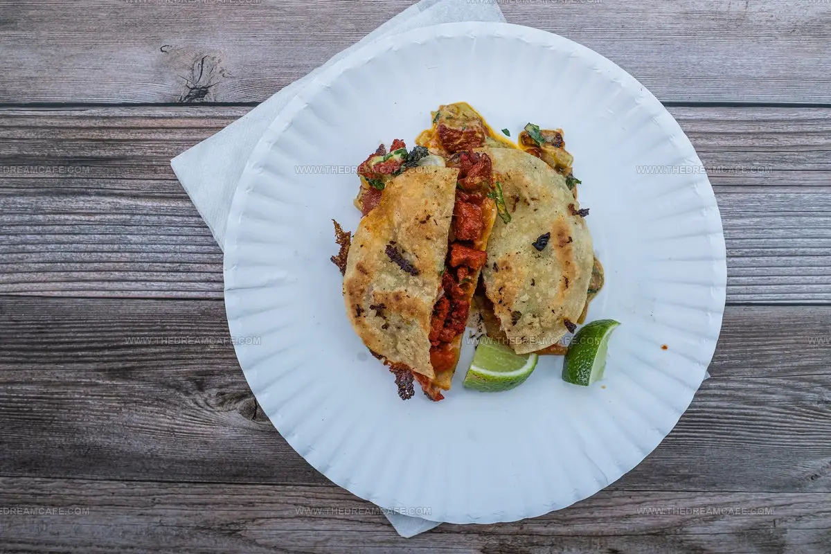 Skillfully folded and brushed with butter, the tacos sizzle on a hot griddle until golden and crispy.