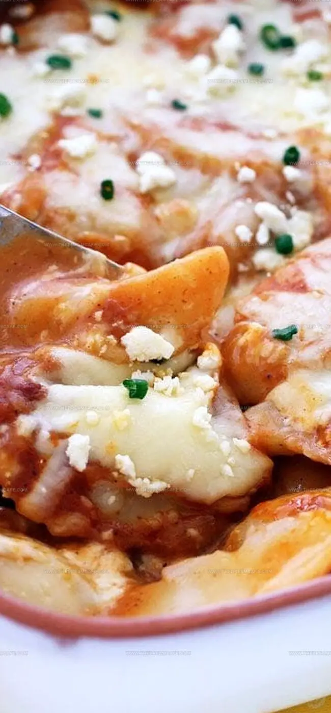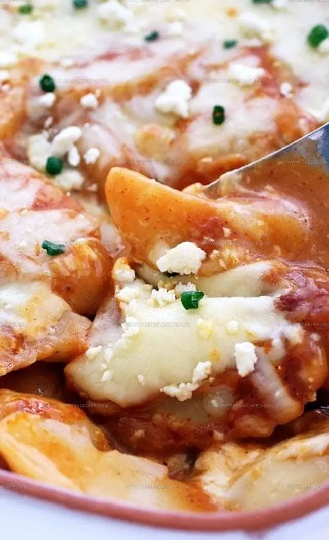 Hearty potato slices absorb spicy sauce and revolutionize into a creamy, decadent casserole that tingles taste buds.