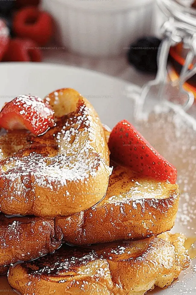 Transfer the warm French toast to serving plates. Drizzle with maple syrup and sprinkle powdered sugar. Optional: Top with fresh berries for an extra burst of color and flavor.