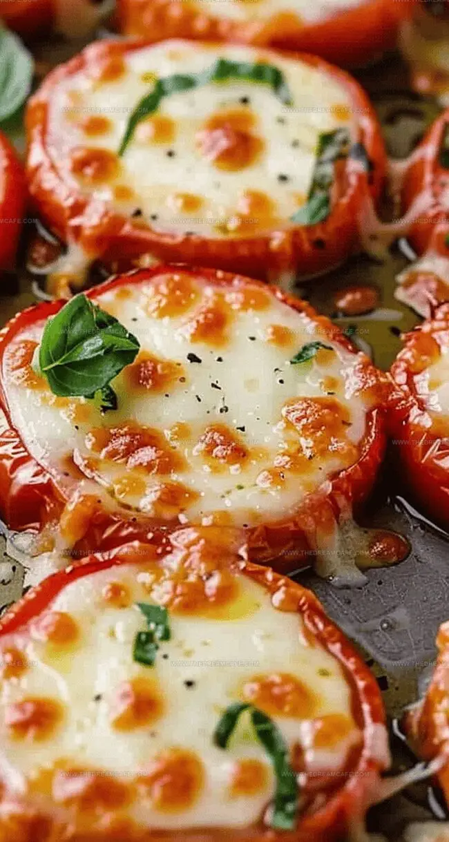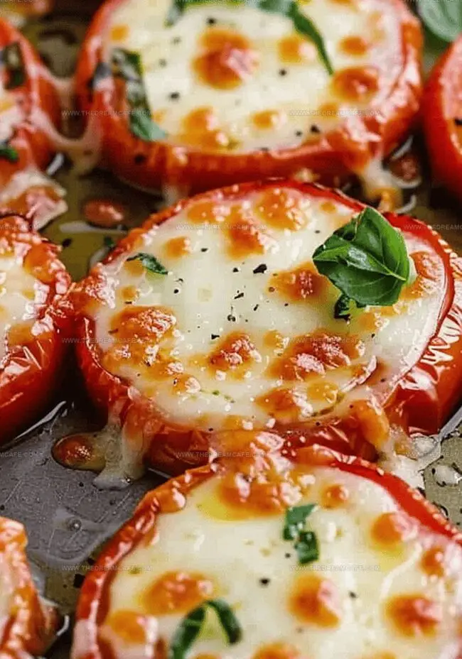 Cheese and Herb Magic Sprinkle a generous layer of creamy Parmesan and melty mozzarella over each tomato slice, then crown them with fragrant fresh basil leaves and a silky drizzle of golden olive oil.