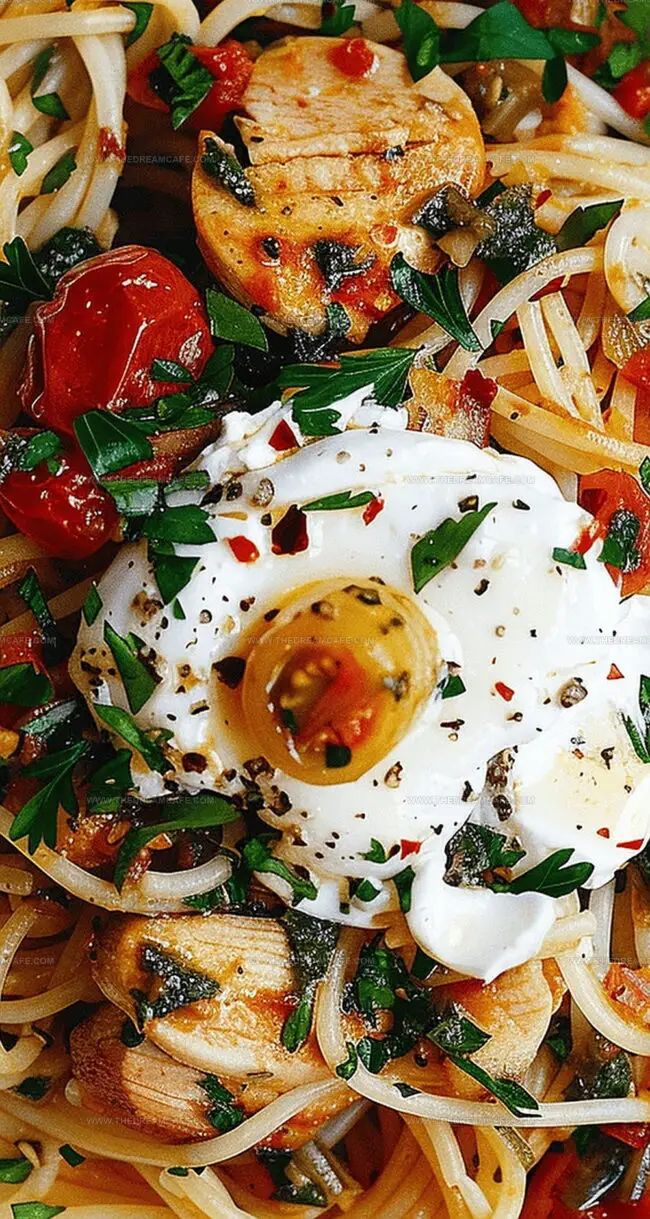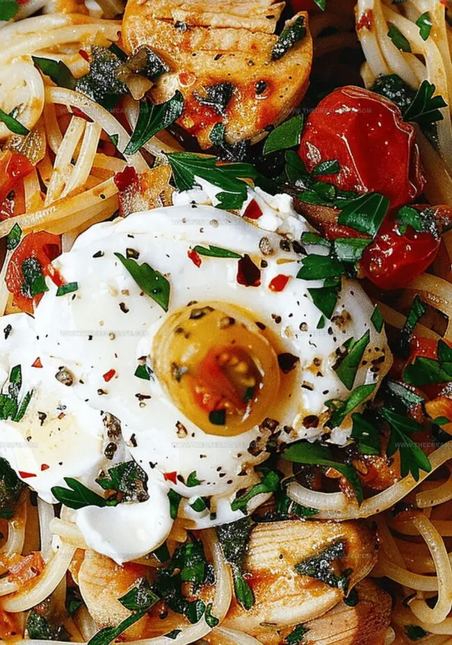 Elegant Plating each plate receives a generous tangle of spaghetti embraced by roasted tomatoes and sliced chicken. Creamy burrata adds luxurious richness while fresh basil leaves and toasted pine nuts provide a final elegant touch that transforms a simple meal into a culinary masterpiece.