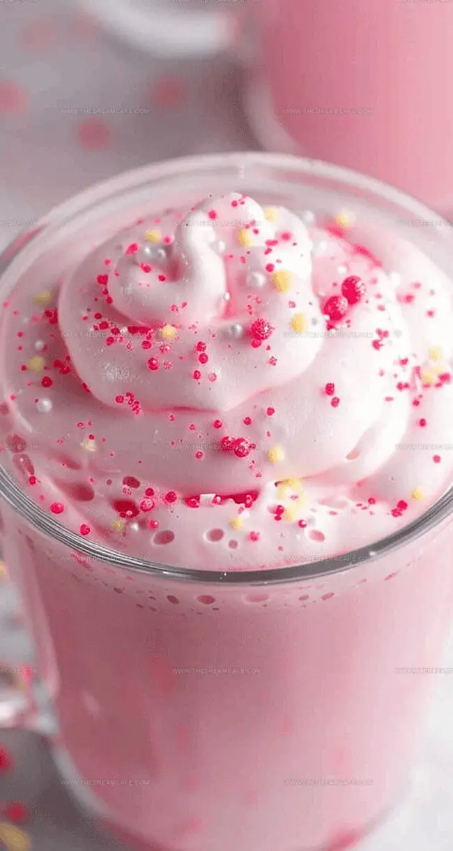 Transfer the rosy concoction into a favorite mug. Crown your creation with a fluffy cloud of whipped cream and a sprinkle of colorful toppings, turning a simple drink into a celebration of flavor and fun.