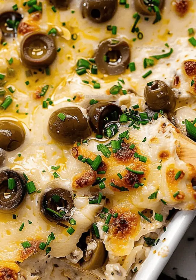 - Cheese Layering: Pour the olive-cheese mixture into the prepared dish, smoothing the surface and topping with additional mozzarella and Parmesan for a luxurious cheese crust.