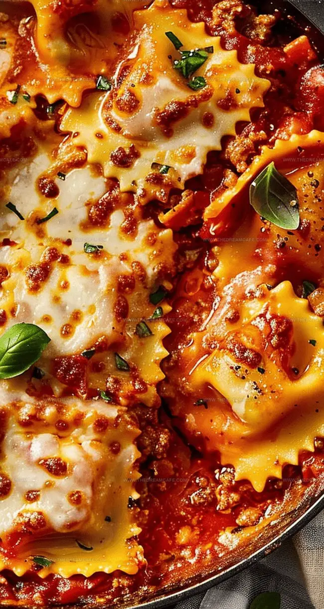 Cheese Layering: Remove skillet from heat and strategically layer ravioli mixture, generously distributing shredded mozzarella between the layers to ensure complete cheese coverage and maximum flavor infusion.