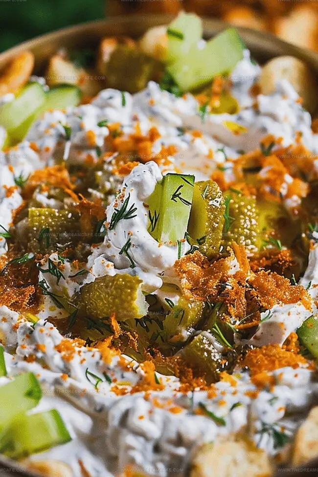 Just before serving, stir in those toasted breadcrumbs for a delightful crunch. Top the dip with a few extra pickle slices and sprinkle fresh dill for a beautiful, appetizing presentation. Serve with crackers, chips, or fresh vegetables.