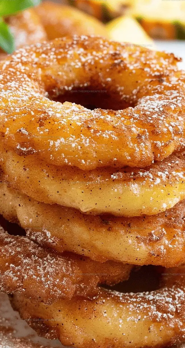 Golden, crispy pineapple fritter rings dance between sweet tropical indulgence and comforting fried goodness.
