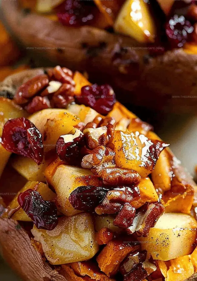 Filling Assembly: Spoon warm apple-cranberry-pecan mixture generously into potato halves, ensuring even distribution.