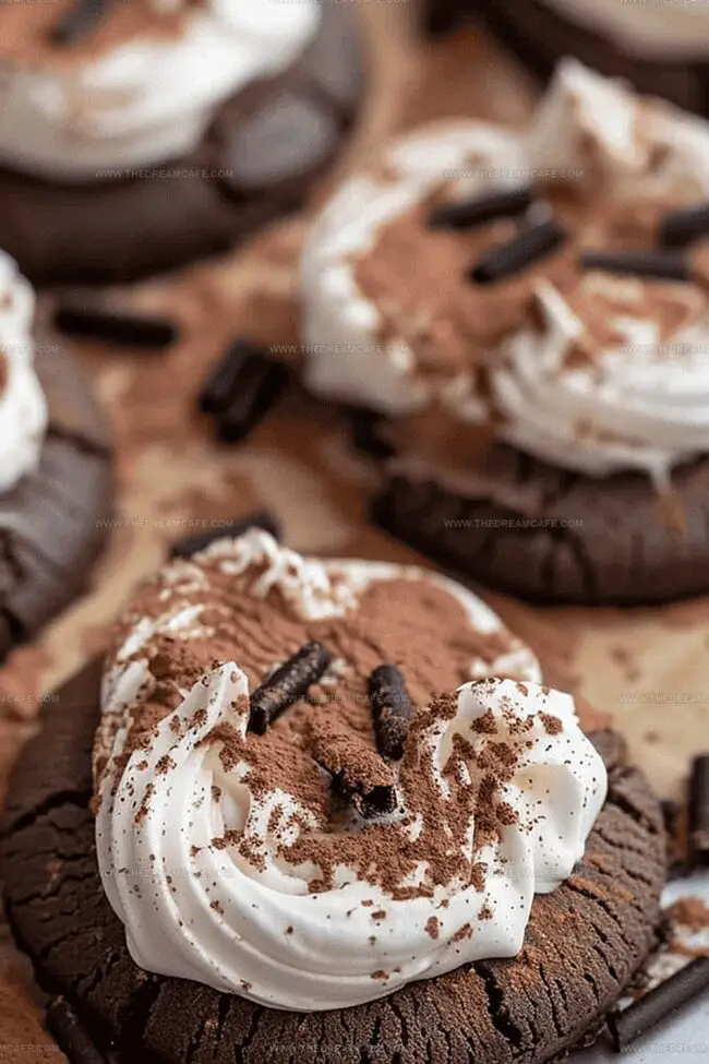 - Top each cookie with a generous dollop of whipped cream and garnish with delicate chocolate curls for an elegant finishing touch.