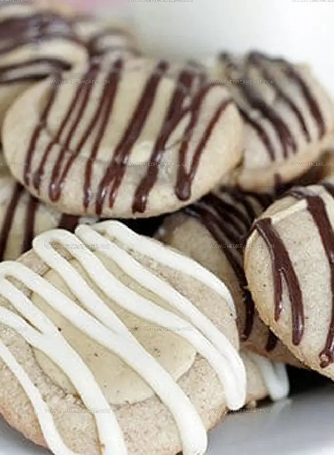 - Using a piping bag or a plastic bag with a trimmed corner, elegantly drizzle white chocolate over half the cookies. Repeat the process with semi-sweet chocolate for the remaining batch, creating a visually appealing two-toned effect.