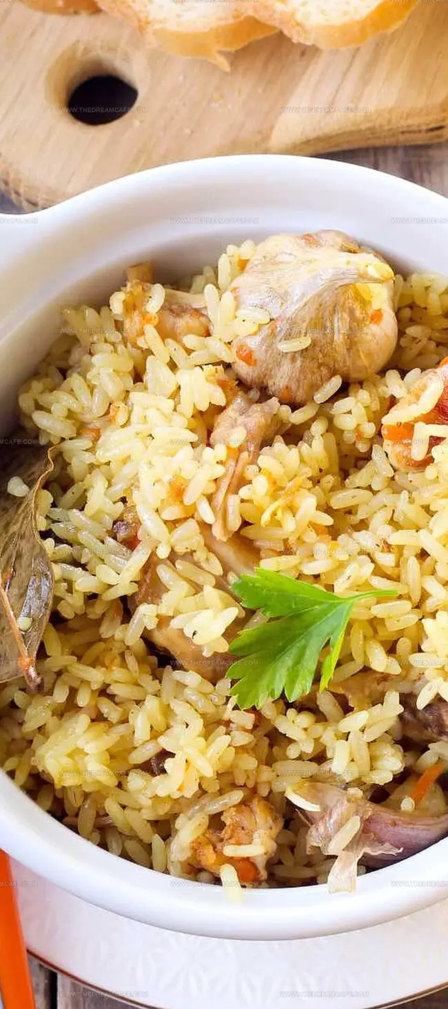 Hearty chicken nestles among tender rice, creating a harmonious blend of protein and carbohydrates.