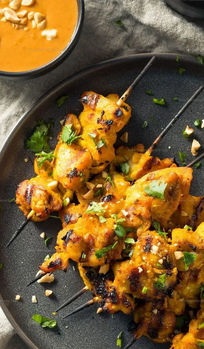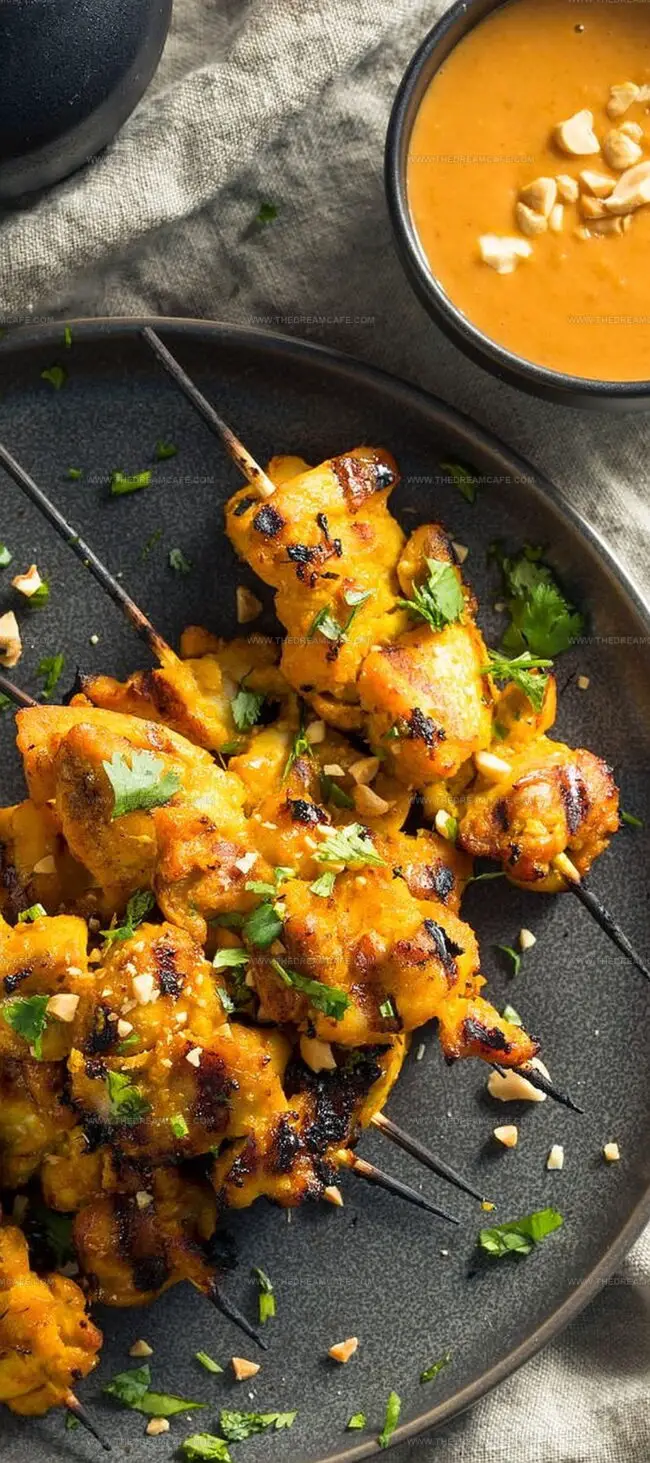 Sprinkle chopped cilantro and green onions over grilled skewers. Drizzle with prepared peanut sauce if desired. Serve immediately while hot.