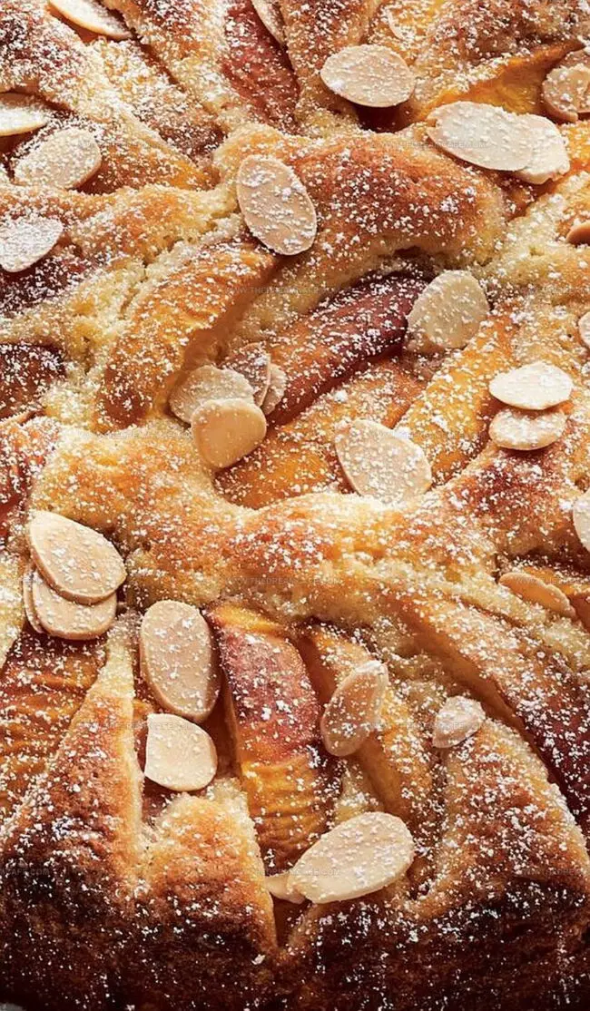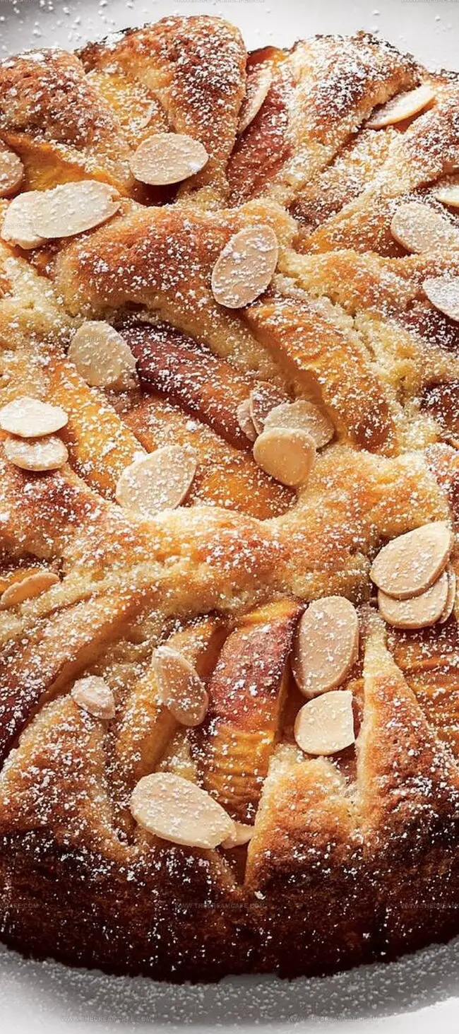 Fragrant peaches nestled atop golden almond-studded batter create an irresistible canvas of flavor and texture.