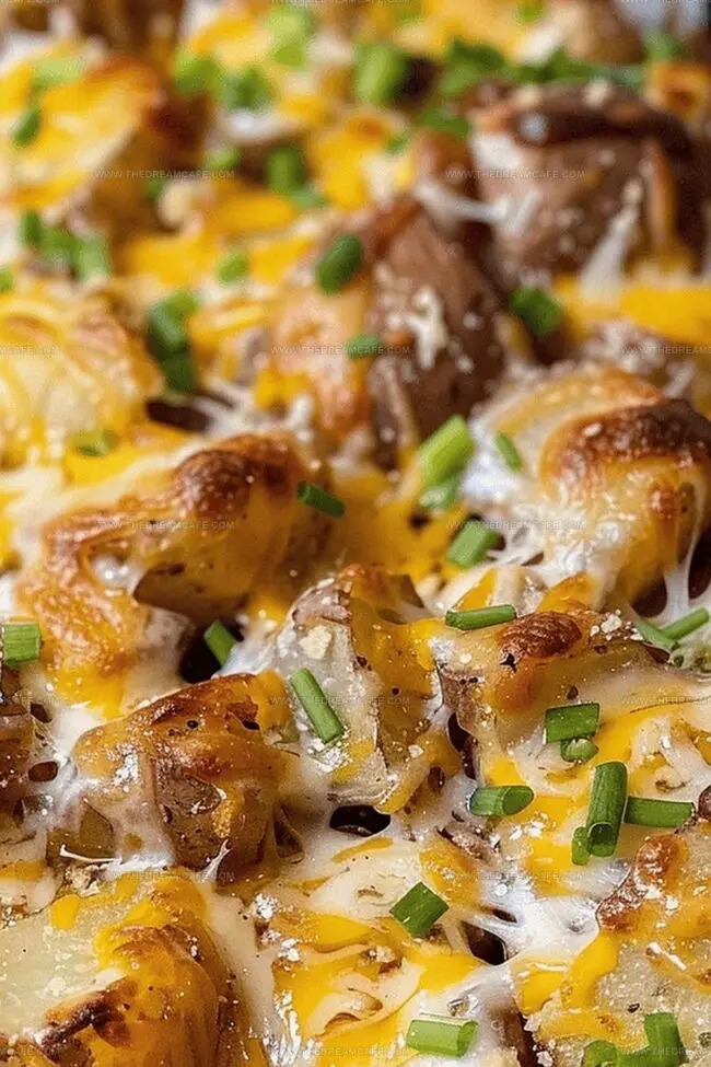 Soft potatoes nestled beneath a bubbling cheese blanket create pure culinary magic in every single bite.