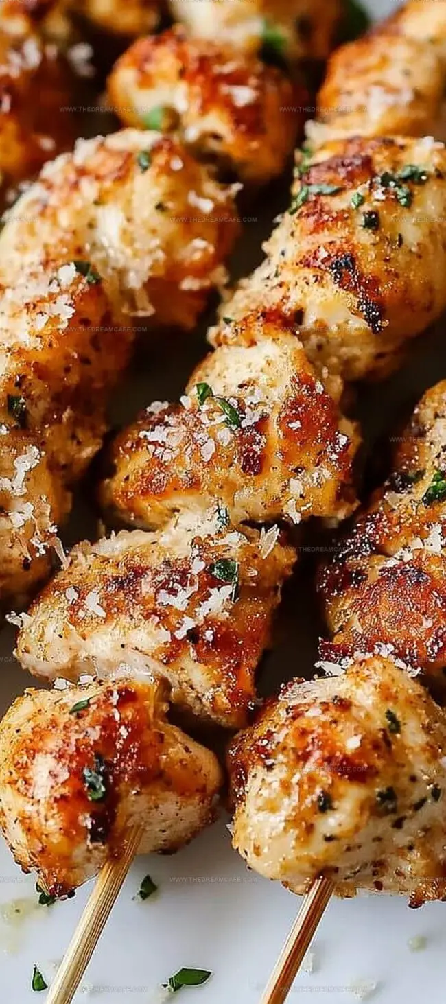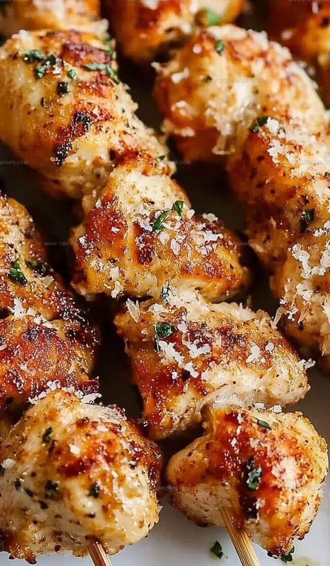 - Remove skewers from heat, allowing chicken to rest for 3-4 minutes. Garnish with additional freshly grated Parmesan cheese or chopped herbaceous elements like parsley or basil for enhanced visual and gustatory appeal.