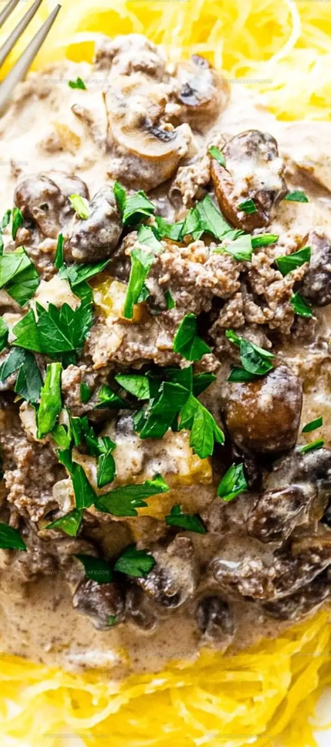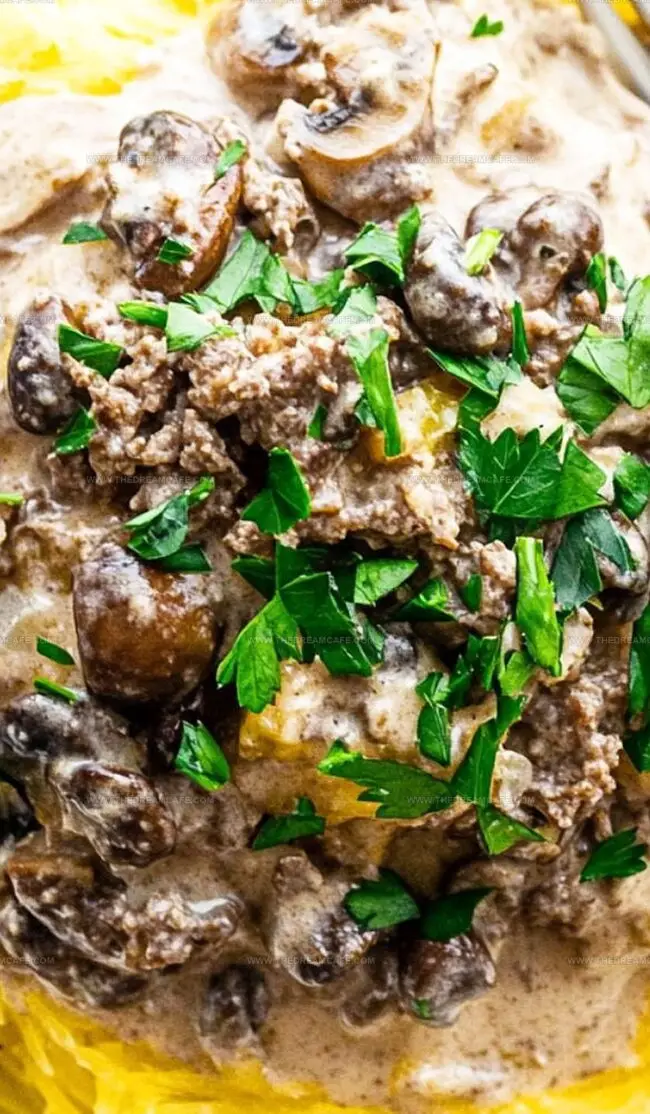 - Transfer the finished beef stroganoff to serving plates, accompanied by spaghetti squash or your preferred low-carb side dish. Garnish with fresh herbs if desired.