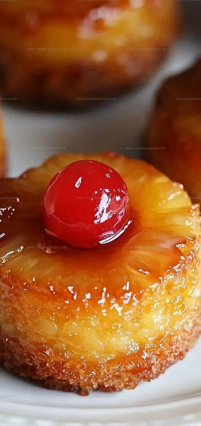 - Drizzle of melted unsalted butter into each muffin cup, then sprinkle of brown sugar evenly across the butter layer. Gently place a maraschino cherry at the center of each cup and carefully distribute crushed pineapple around it, pressing softly to create an even, attractive base.