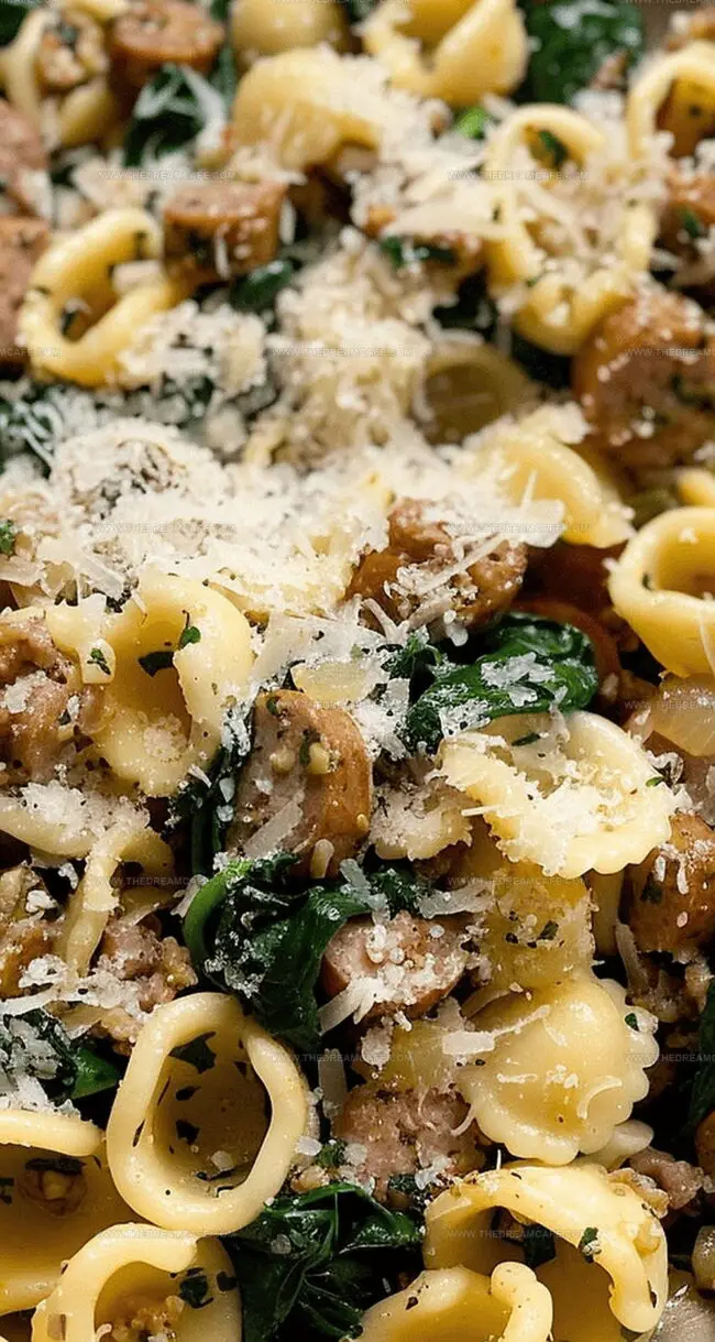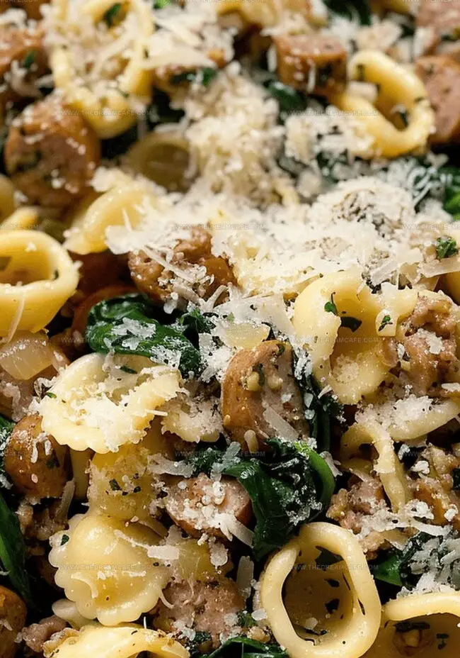 The small, ear-shaped pasta perfectly cradles savory sausage and tender spinach in a harmonious blend.