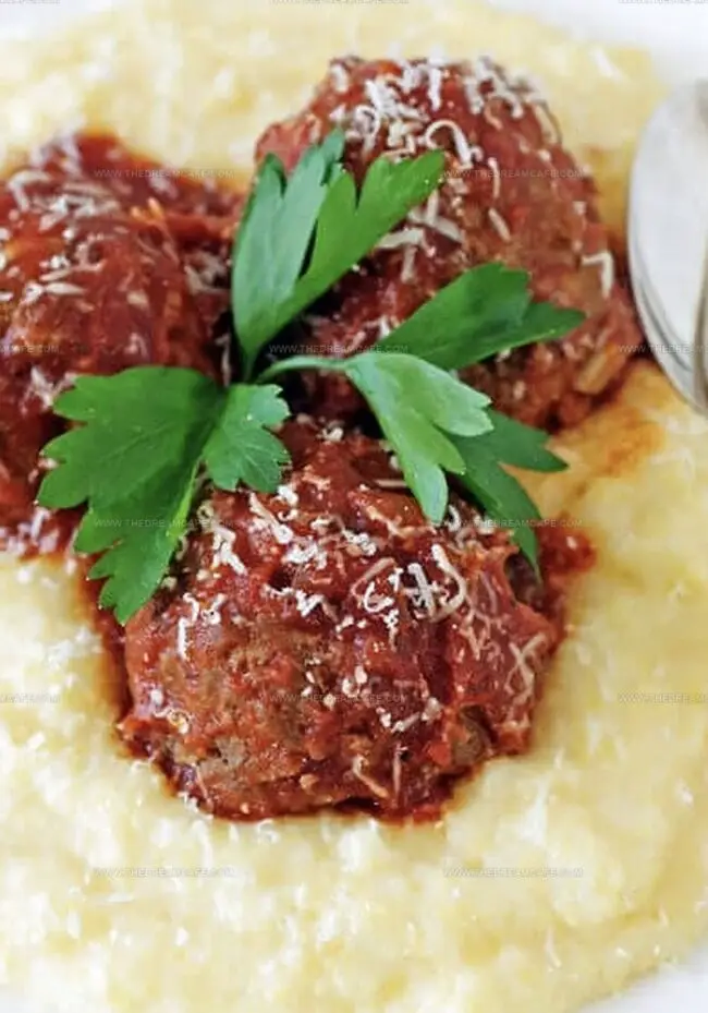 - Final dish marries hearty meatballs with creamy polenta, delivering a comforting Italian-inspired meal.