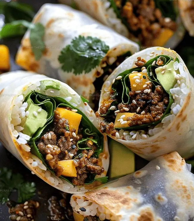 Tortilla Preparation and Assembly: Gently warm tortillas, then strategically layer with seasoned beef, fluffy white rice, vibrant cilantro, emerald green onions, creamy avocado cubes, sweet mango segments, crisp bell pepper pieces, and toasted sesame seeds.