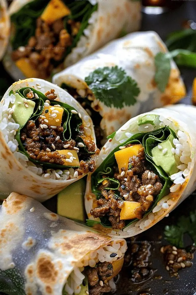Roll Creation Spread warm tortillas and lovingly layer each with seasoned rice, tender beef, vibrant herbs, creamy avocado chunks, bright mango pieces, crisp bell pepper slivers, and delicate sesame seed sprinkles. Carefully roll each tortilla into a tight, compact package.