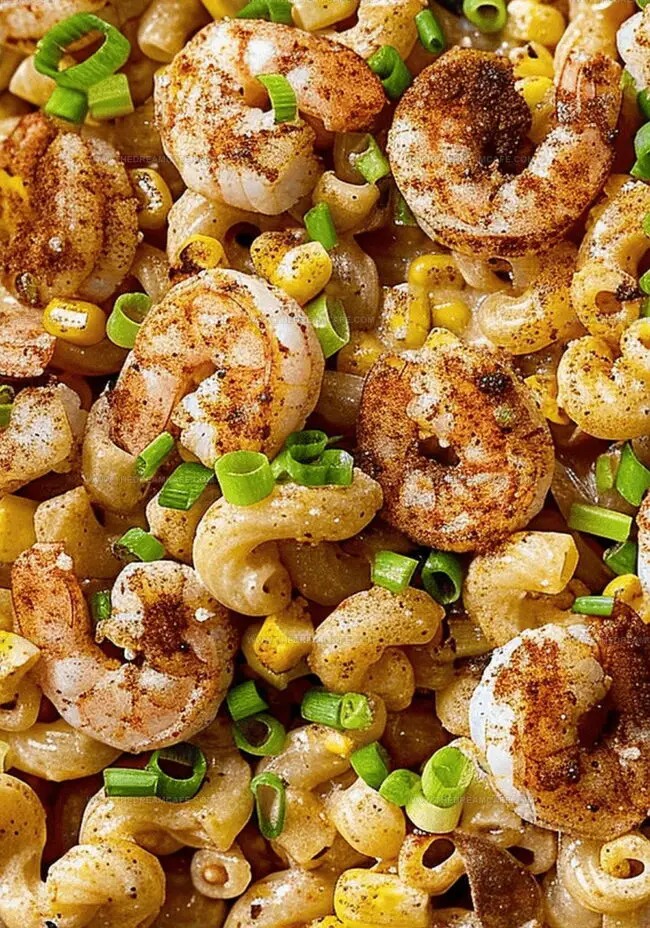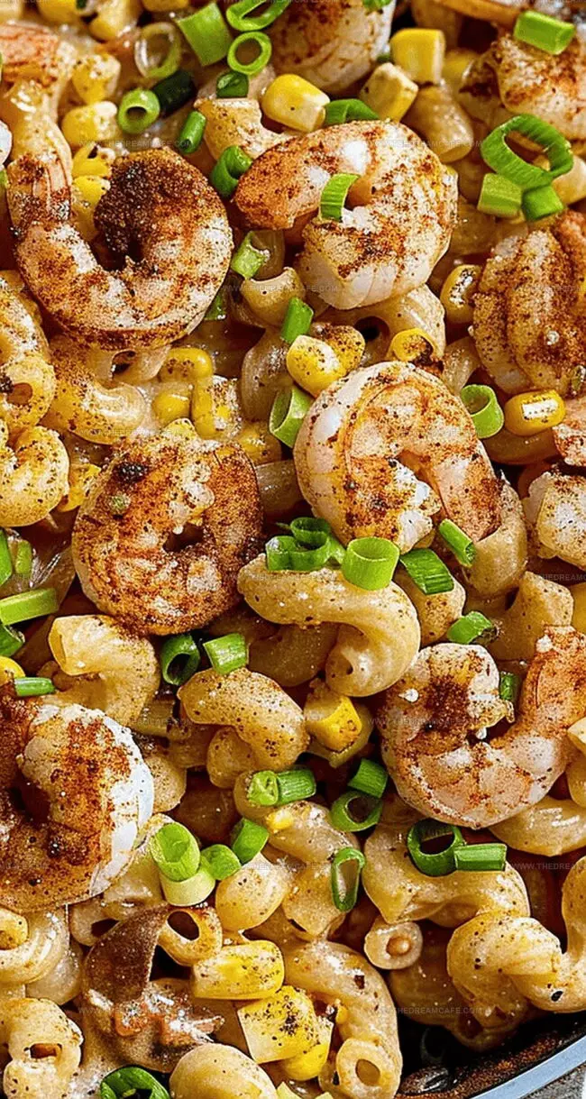 Combine pasta, succulent shrimp, and sweet corn into the creamy sauce, tossing until every ingredient is beautifully coated. Sprinkle fresh green onions on top for a vibrant finish and serve immediately.