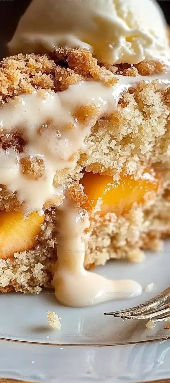 Fresh, ripe peaches nestle into a tender cake base, promising pure deliciousness in every slice.