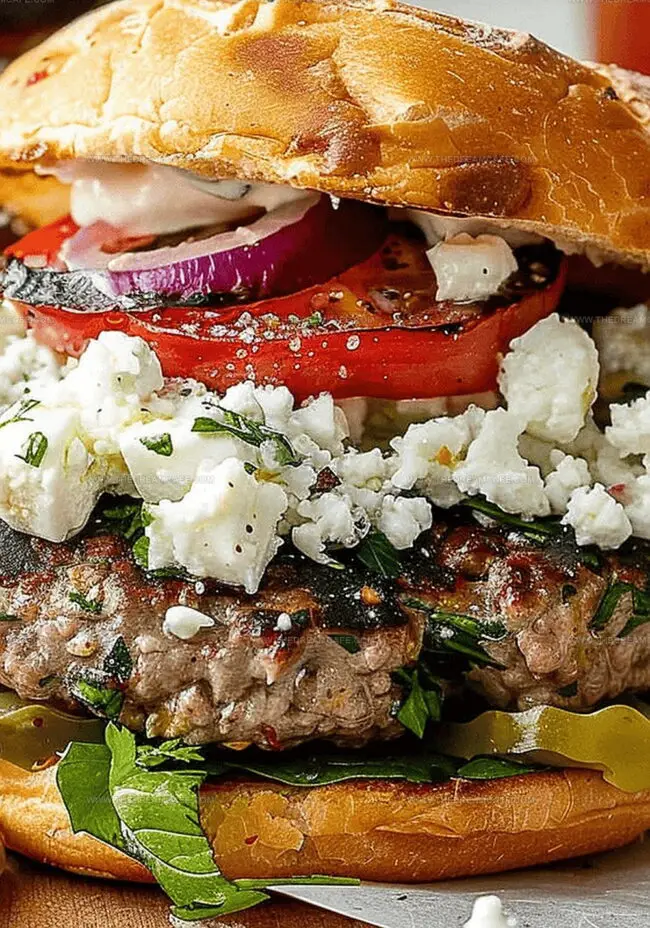 Feta Cheese: Crumbly, salty cheese that adds sharp, tangy notes and authentic Mediterranean essence to the burger.