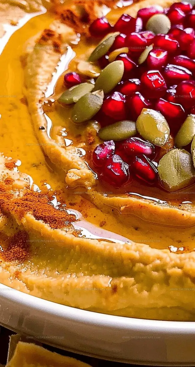 Spread the vibrant orange hummus in a wide serving dish. Scatter roasted squash cubes on top. Sprinkle pomegranate seeds and candied pumpkin seeds for a delightful crunch.